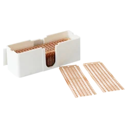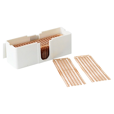 Bandoliers contain 20 non-adhesive brass shim clips per carrier and are designed for fast, consistent SMT tape splicing without handling individual clips.