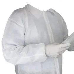 This disposable visitor lab coat is designed for use by visitors in cleanroom and laboratory environments, offering reliable protection and comfort. It is manufactured from a 40gsm trilaminate nonwoven material, consisting of a melt-blown layer sandwiched between two layers of spunbond polypropylene. This construction delivers excellent breathability, low linting, and high abrasion resistance, making it ideal for controlled areas.