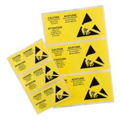 ESD caution labels are yellow with black print and carry the ESD susceptibility symbol along with clear cautionary text. Available in English, German, and multi language (English, German and French) versions, these self-adhesive labels are ideal for marking electrostatic sensitive devices across global operations. Gloss paper with backing paper for all reel stock applications, suitable for automatic dispensing