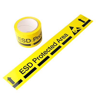 ESD protected area tape provides clear visual identification of EPA boundaries. Printed with the ESD caution logo and “ESD Protected Area” text in black on a yellow background, it meets EN61340-5-1 standards for clarity and consistency.
