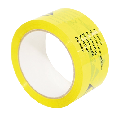 ESD warning packaging tape is a self-adhesive PVC tape, with an acrylic gum adhesive for sealing outer cartons. It is printed with the ESD susceptibility logo as specified by EN 61340-5. The yellow tape with black print alerts handlers to electrostatic sensitivity, ensuring the package is opened safely. Sold by the roll. Tape width 50mm, roll length: 66m, with a 75mm core diameter.
