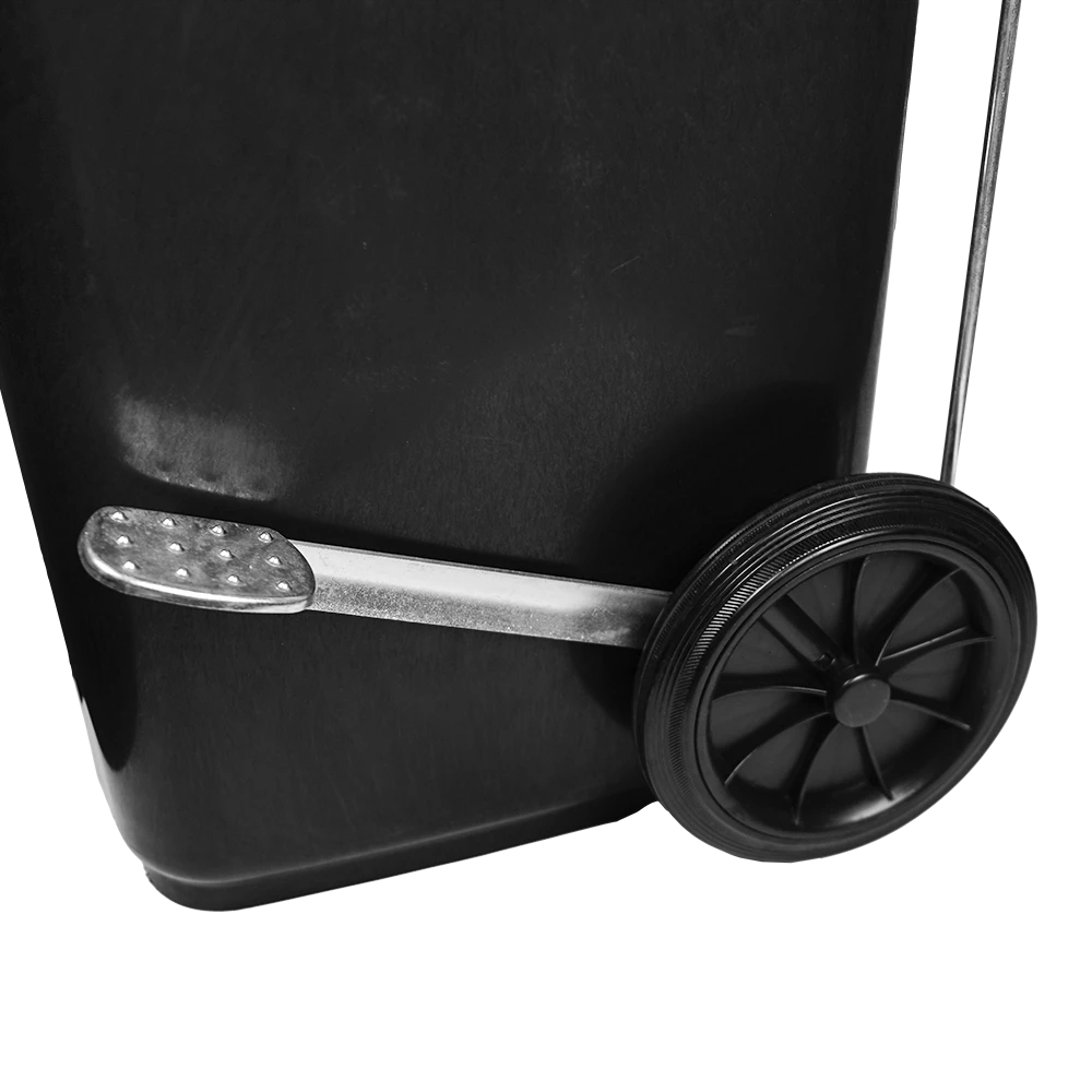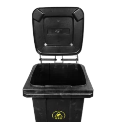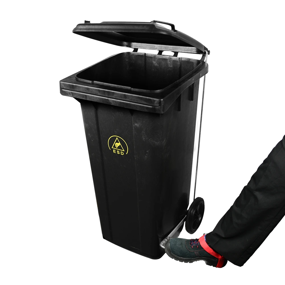 Built for durability and ease of use, each bin features a yellow ESD warning logo, washable surfaces, wheels for easy mobility, and a foot-operated lever for hands-free opening.