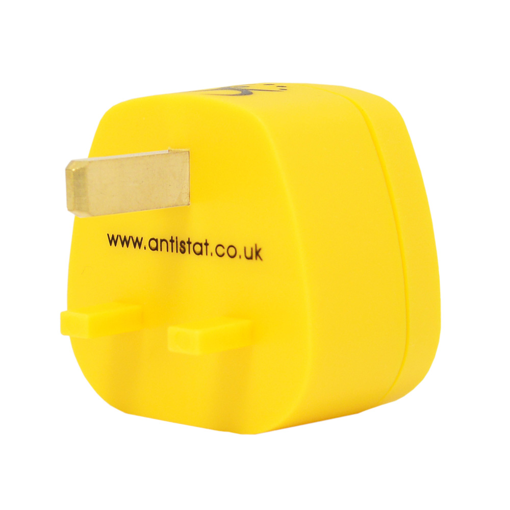 The banana plug is designed for use with UK mains socket outlets and features a metal earth pin for reliable grounding. The neutral and mains voltage pins are plastic to prevent electrical connection, ensuring operator safety. A built-in 1 megohm resistor provides controlled resistance for the safe dissipation of static electricity, making it ideal for use in electrostatic discharge (ESD) environments.