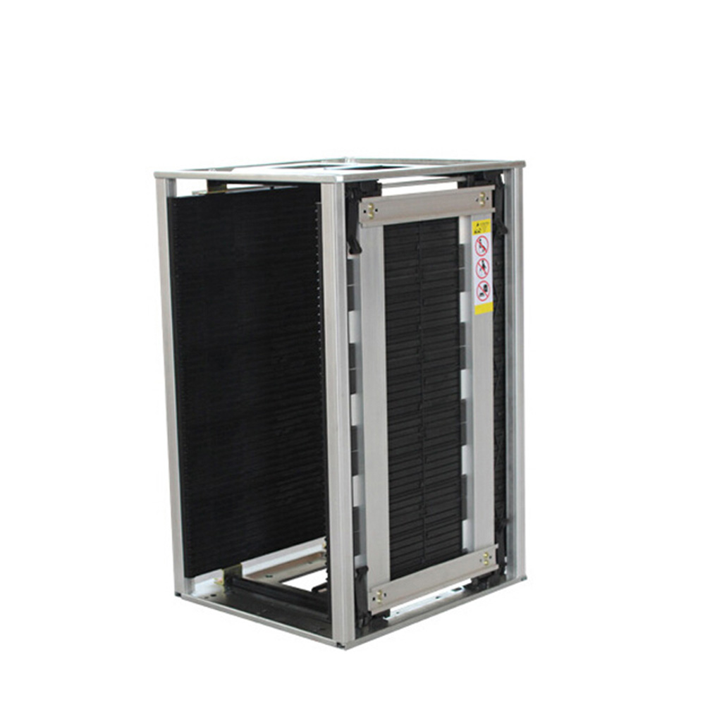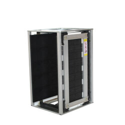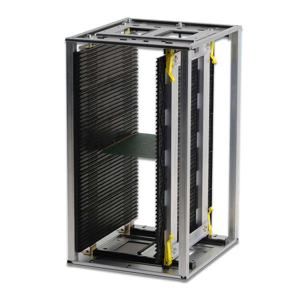 The ESD magazine rack is designed for the manufacture, assembly, and transfer of PCBs in static-sensitive environments. Featuring a gear adjustment system, it allows widths from 50mm to 250mm and can securely hold up to 50 PCBs.