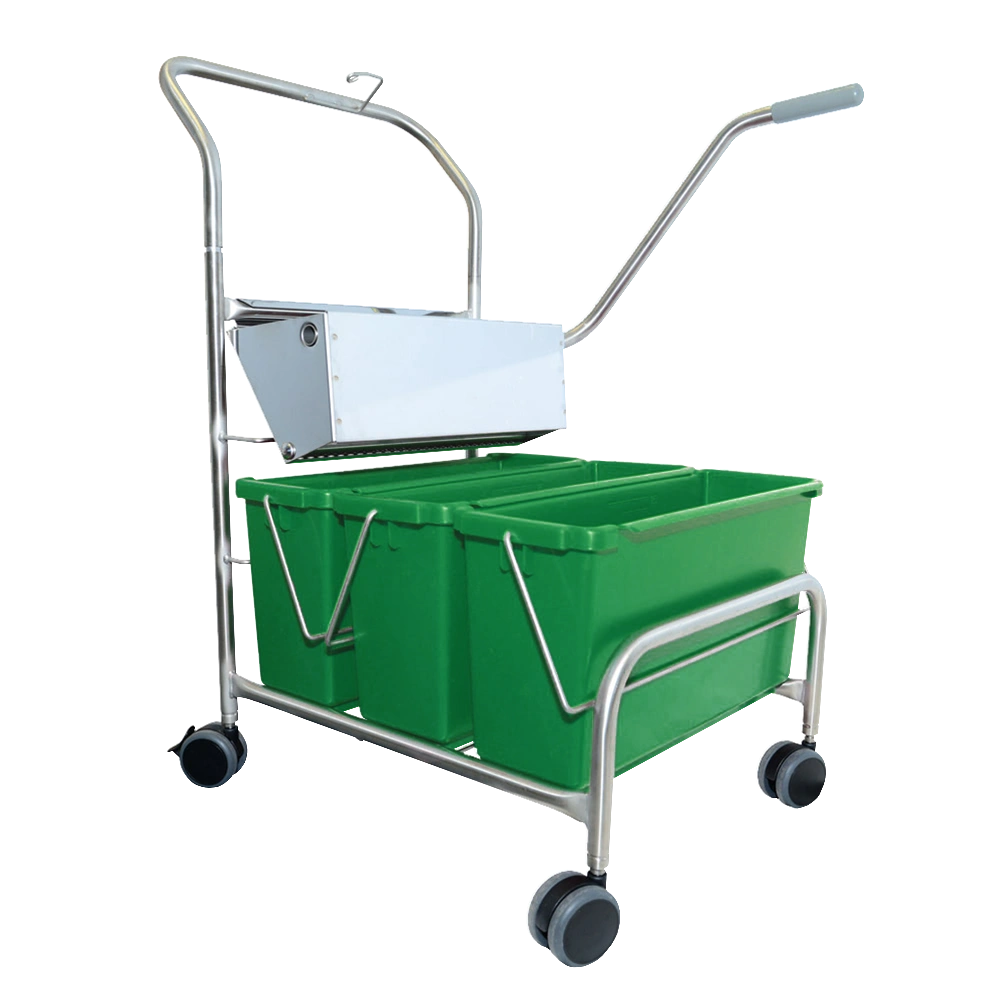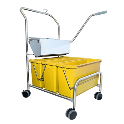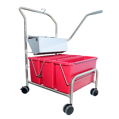 The Integrity triple bucket mopping system features a durable, lightweight stainless steel cart and three 15L high-temperature resistant polypropylene buckets. The cart is fitted with four 3in casters, including one lockable caster that can be engaged with a simple foot action for secure positioning.